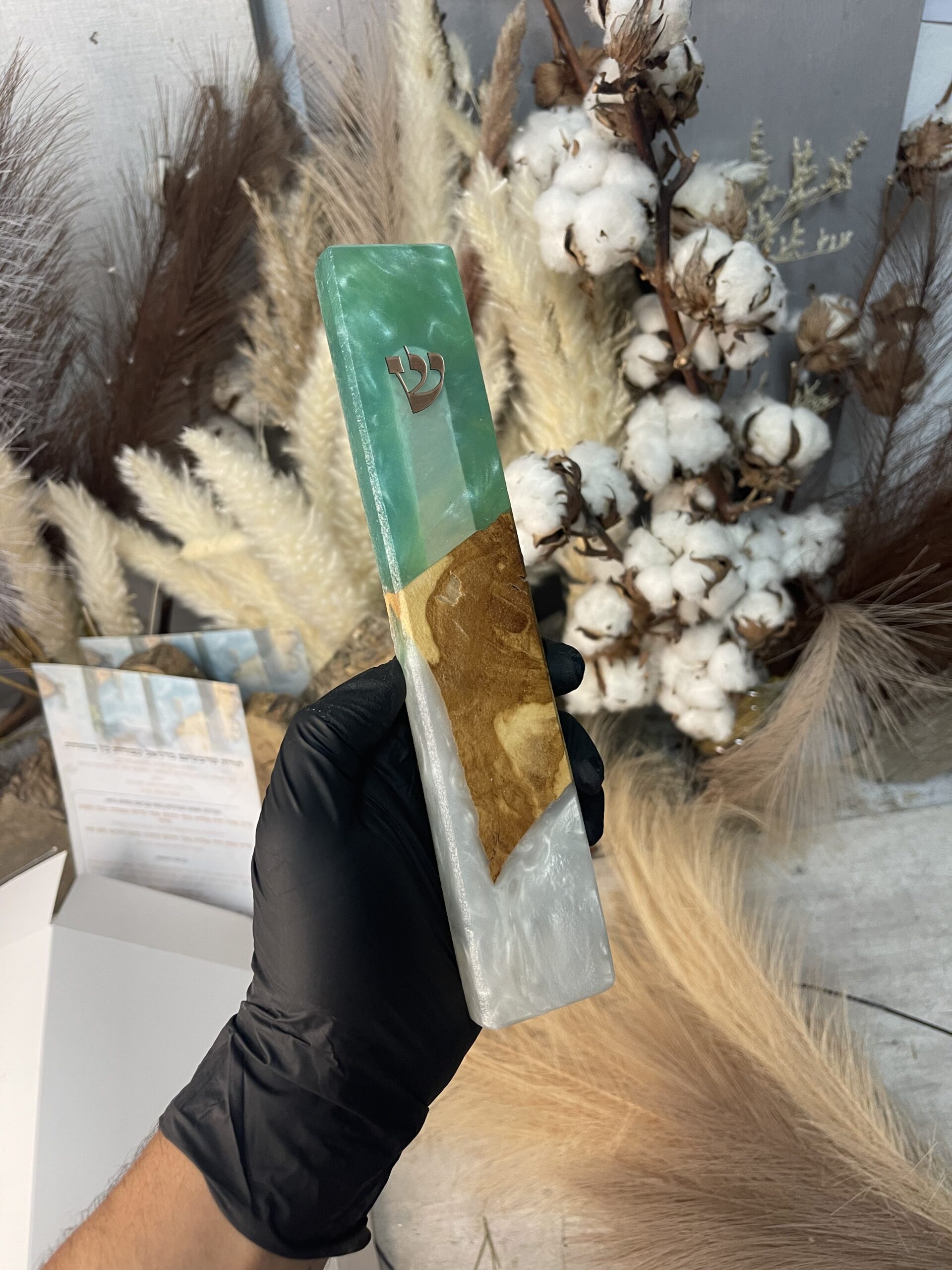 בית מזוזה מאפוקסי בגוון טורקיז ולבן משולב עץ זית 22 ס"מ